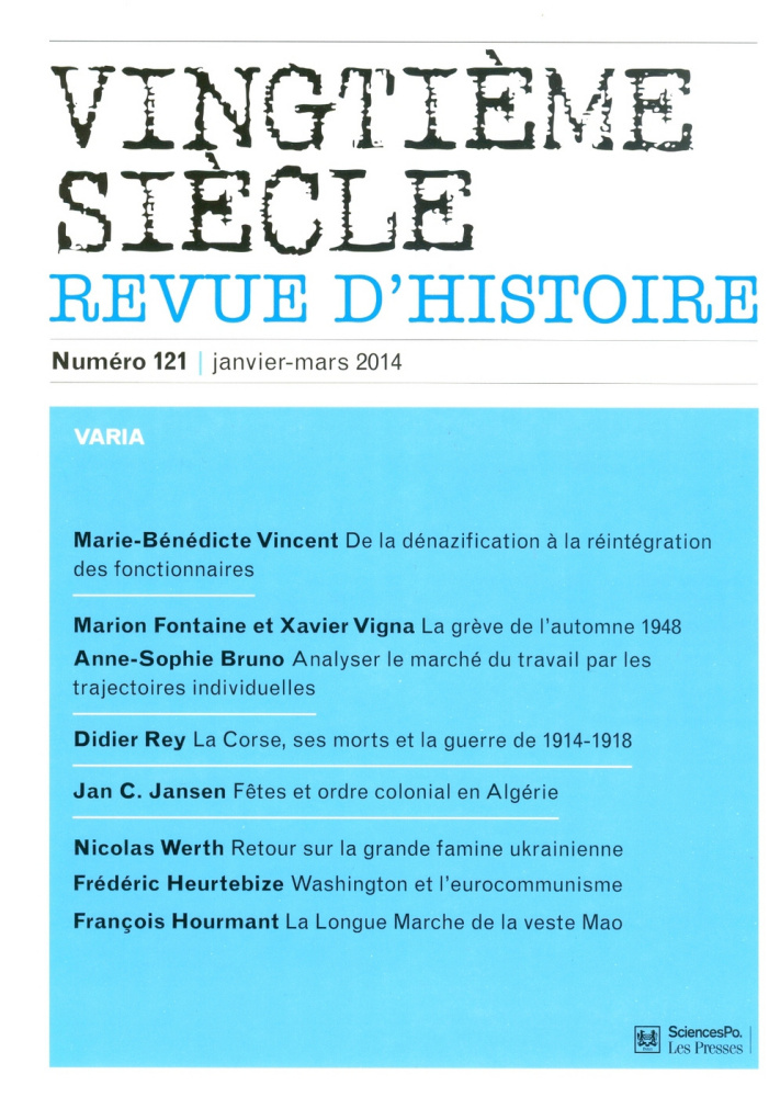 Au sommaire notamment : De la dénazification à la réintégration des fonctionnaires - La grève de l'automne 1948 - Analyser le marché du travail par les trajectoires individuelles - La Corse, ses morts et la guerre de 1914-1918 - Fêtes et ordre colonial en Algérie - Retour sur la grande famine ukrainienne - Washington et l'eurocommunisme - La Longue Marche de la veste Mao
